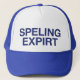 SPELING EXPIRT fun and ironic slogan on trucker hat, blue, funny typographic statement, inspired by tv comedy character frank rossitano.