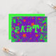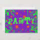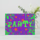 Invitation with a swirling purple and green background scattered with magical, glowing orange stars and the word 'Party' written in bright green. A purple, green and orange customisable design for you to add your own text, images and ideas. The text can easily be changed using the template provided or click the 'Customise It' button to make further alterations. Matching envelope and postage stamp available. Created using digital techniques by Jess Perry.