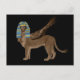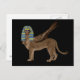 A digital painting of the great sphinx. A sphinx is of a lions body, with wings and the head of a woman. An Egyptian blue and yellow headdress and make-up is on the female form of the sphinx. She has a long, lean lion body with large brown wings.