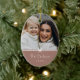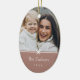 Sweet and simple oval-shaped Christmas photo ornament features a minimalist layout, with your family name and the year in clean, classic serif typeface on a soft earth tone terracotta background. A petite bow beneath your photo completes the design.