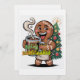A joyful, cartoon-style Gingerbread Man, depicted with a wide, enthusiastic smile and rosy cheeks. He's wearing a simple white apron and heartily holding up a clear mug filled with dark, steaming coffee, with a prominent plume of steam curling upwards. The text "Spicy and Caffeinated" is creatively integrated onto the coffee mug in a bold, vibrant, multi-colored font, featuring subtle star and flake embellishments. In the background, a minimalist yet festive green Christmas tree is adorned with red and gold baubles, topped with a star, and radiating faint yellow light rays. The overall style is clean, cheerful, and graphically strong, with clear outlines.