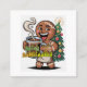 A joyful, cartoon-style Gingerbread Man, depicted with a wide, enthusiastic smile and rosy cheeks. He's wearing a simple white apron and heartily holding up a clear mug filled with dark, steaming coffee, with a prominent plume of steam curling upwards. The text "Spicy and Caffeinated" is creatively integrated onto the coffee mug in a bold, vibrant, multi-colored font, featuring subtle star and flake embellishments. In the background, a minimalist yet festive green Christmas tree is adorned with red and gold baubles, topped with a star, and radiating faint yellow light rays. The overall style is clean, cheerful, and graphically strong, with clear outlines.