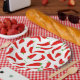 Check out these fun party plates patterned with spicy red chilli peppers, on a white background. Perfect for serving hot and spicy food.