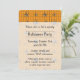 This invitation features a bright orange background creating a perfectly Halloween-themed base for a repeating pattern of black web crawling with spiders. These spiders, modelled after the false widow, feature a bright white skull on their abdomens and other white markings on their body and legs. The lower portion of the card has some sample text that you can customise to create a personalised invite for your spooky party.