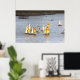 This photographic image of small sailboats is unusual in that they are gathered closely and also sailing with colourful spinnakers. This photo shows the sails glowing near sunset.