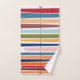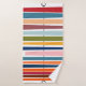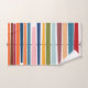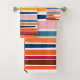 This towel set has a mid-century modern design of horizontal coloured lines on a vertical black line with circles.
