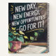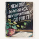 A Spiral Bound Notebook - Inspirational Quotes - with the design of a chalk drawing on a chalkboard shows a spiral-bound notebook in the foreground, slightly open with its pages curled next to a vibrant vine-like plant in a pot with tendrils winding around the edges of the notebook, soft rays of sunlight spilling across the chalkboard, casting a warm glow over the scene, the words 'New day, new energy, new opportunities—go for it!' written in bold, cartoony, balloon-like chalk lettering with streaks of beige and highlighted black running through the rounded text, giving it depth and a playful, energetic feel, surrounded by soft pastel accents in yellow, teal, and pink, creating an uplifting and motivating atmosphere.