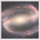 Spiral galaxy NGC 1300. Radio light is represented in yellow and highlight the clouds of cold molecular gas that provide the raw material from which stars form. Red and magenta colours capture the impact of young, massive stars on their surrounding gas. Visible and ultraviolet light highlight dust lanes in gold and very young, hot stars in blue.