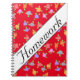 Personalise the homework text to any message on this little flowered red spiral notebook, the centre stripe can also be changed to any colour. The red background can be switched to any colour.