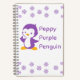 Simple notebook for notes, to do lists, recipes, drawing and more with a peppy purple penguin on the cover and a whimsical snow scene on the back.