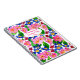 A very pretty notebook with an allover pattern of pink, blue and deep red primulas, from a handpainted design by Judy Adamson. There is an oval space for you to add your name or the title of the nobtebook in pink lettering.