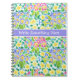 A spiral notebook or journal, with a pattern of deep pink, deep blue and yellow primroses, from a handpainted watercolour design by Judy Adamson.