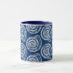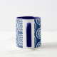 Mug in a block print pattern, based on a spiral seashell, in white on a cobalt blue background