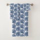 Towel set in a block print pattern, based on a spiral seashell, in cobalt blue on a white background