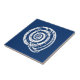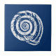 Ceramic tile in a single block of a spiral seashell, in white on a cobalt blue background