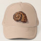 traditional watercolor artwork of a spiral shaped snail shell or carapace in brown colours on a brown coloured trucker hat.