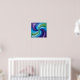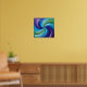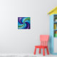 This poster is a vibrant abstract painting that features a colorful swirl of shapes and hues. The composition forms a symmetrical spiral pattern that draws the eye inward. Starting from the outer edge, there's a deep purple that fades into lighter shades of violet as it moves clockwise towards the center. These colors give way to various shades of blue, ranging from turquoise to rich cobalt blues, creating an almost three-dimensional effect. In the heart of this spiral, there's a striking contrast with vibrant greens that blend into light teal, followed by more variations of blue, including sky blue and aqua tones, which then transition back into deeper blues towards the center. The green and blue hues intertwine harmoniously, reminiscent of the blending of watercolor paints or a whirlpool of color.