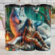 A serene Native American woman with long, flowing braids and feathered adornments sits gracefully by a calm stream. A majestic grey wolf with piercing blue eyes rests protectively beside her. A soft campfire flickers in the foreground, while a white dove flies overhead in a lush, mystical forest setting, symbolising peace and harmony.