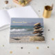 This guest book has a peaceful design of stacked stones in beach sand with the ocean in the background . Personalised text template may be customised with your event title or deleted.