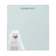 Image of a cute fluffy white American Eskimo Spitz breed type dog in the lower left corner, set on solid pale blue. Personalise with your name or message in black minimalist font.