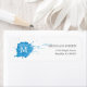 Splash of watercolor in the left corner with a custom monogram and a return address aligned on the right in sans serif font.
