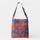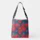 Large scarlet red, medium navy blue, and small royal purple daisy-like flowers are scattered across a rich jungle green background to create a colourful floral pattern that is perfect even for autumn. Customise the monogram with your own initial to make a unique accessory. This bag is available in multiple sizes and both tote bag and cross body bag styles.