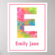 Cute print for nursery or kid's room features multi-coloured splatter paint letter E with customisable pink text and a thin pink border frame.