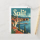 A captivating vintage illustration of Split, a historic city on the Dalmatian coast of Croatia. The design showcases the ancient Roman architecture, stunning coastal views, and lively streets that define this beautiful destination. With a nostalgic and retro aesthetic, the artwork highlights Split's rich heritage and Mediterranean charm, inviting viewers to experience its timeless allure.