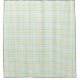 Split image showing a pastel plaid shower curtain. Top: Close-up of the yellow, blue, and white checkered pattern. Bottom: Curtain hanging in a bright, modern bathroom.