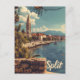 A captivating vintage illustration of Split, a historic city on the Dalmatian coast of Croatia. The design showcases the ancient Roman architecture, stunning coastal views, and lively streets that define this beautiful destination. With a nostalgic and retro aesthetic, the artwork highlights Split's rich heritage and Mediterranean charm, inviting viewers to experience its timeless allure.