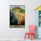 This vintage travel poster is of a castle on a hill advertising Spoleto, Italy. The colores are rich oranges and greens.