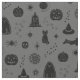Spookie Things is a collection of spooky characters associated with the autumn celebration of Halloween. This collection, arranged in a repeating pattern, features a bat, ghost, cat, spider web, witch's hat, jack-o-lantern, pumpkin, spider web, tombstone, moon, skull, stars, and magic sparks. This version is presented in dark grey and deep black.