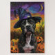 Embrace the Halloween spirit with this enchanting design featuring a cute dog in a witch hat surrounded by carved pumpkins. Perfect for adding a touch of spooky charm to your festive celebrations.