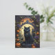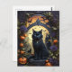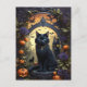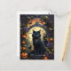 Embrace the spooky spirit of Halloween with this hauntingly beautiful postcard, featuring a majestic black cat sitting confidently amidst a gothic archway. Surrounded by carved pumpkins, eerie bats, and dark purple flowers, the scene perfectly captures the mystical allure of Halloween night. In the background, a haunted house and glowing moon add to the enchanting atmosphere. Ideal for sending bewitching greetings to friends or for adding a magical touch to your Halloween decor!