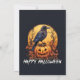 This Halloween party invitation features an illustration of a perched black crow. This festive invitation can be easily edited to display when, where and a short list of Halloween bash details you can adjust to make this card quite personal.