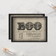 Intricate lettering spells out "BOO" and invites your guest to join you if they dare for a Halloween scare! Set against a faux burlap background, this invitation adds a little mystery to your Halloween party. Matching products also available.