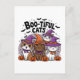 A group of playful cats with witch hats enjoying Halloween pumpkins, ideal for festive t-shirts or decorations.