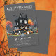 Welcome guests to your Halloween costume party with this spooky yet simple invitation. The design features a dark grey background with a black and white colour scheme, paired with a mix of ornate and serif font typography. At the centre of the invitation is a black haunted house, accented with pops of orange from pumpkins, jack-o-lanterns, and eerie trees. Playful ghosts and bats float around to complete the fun, spooky vibe. The font has a vintage, grunge-inspired feel, giving the invitation a nostalgic, old-timey look. This Halloween party invite is perfect for setting the tone for a night of spooky fun.