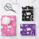 Cute set of three wrapping paper sheets featuring an adorable Halloween ghost pattern . One is pink , one is black and one is purple .
