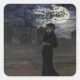 A dark-haired fairy dressed in a long black robe stands in the light of a full moon near an old ivy-covered gate while bats fly overhead.