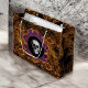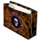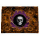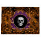 This spooky but elegant design features a scary skull, encircled in black and surrounded with a purple and orange frame. Lacy orange and black damask roses, leaves, and lacey frills adorn the background. The vibe is fancy but definitely strikes a Goth or Haloween vibe.