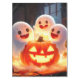 A charming ghost family, smiling and playing joyfully around a glowing pumpkin. A warm a whimsical Halloween-inspired atmosphere with soft colours.