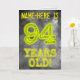 The front of this eerie looking, editable birthday card design features the message "94 YEARS OLD!" with characters and digits having a mysterious glowing aura inspired look, on a spooky grey cloudy mist-inspired background pattern. The front also features a personalised recipient name. The inside features a customisable birthday greeting message. A customised birthday greeting card like this might be given to celebrate somebody’s 94th birthday. [~Z0000365]