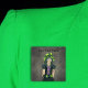 This square pin back button has a spook Goth teenage girl with green and black hair in a neon green hat with spiderweb tattoo on her face against a dark grey with greenish glow background. Customise your text with the template.