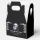 Send your guests home with a hauntingly beautiful token of your appreciation in these gothic favour boxes. The striking design features the romantic "Till Death Do Us Part" skeleton couple, framed by elegant red and white roses on a deep black background. Perfect for gothic weddings, Halloween receptions, or any darkly romantic event, these boxes are ideal for holding candies, small trinkets, and other special treats. This template is fully customisable, allowing you to add your names and wedding date, creating a perfectly personalised thank you gift that beautifully concludes your celebration.
