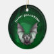 This hanging ceramic ornament has a spooky grey bat with wings spread in flight in front of a haunted glowing green cave. Customise the Happy Halloween text with the template.