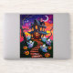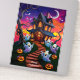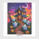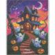 Explore this enchanting Halloween illustration featuring a spooky haunted house under a crescent moon, surrounded by pumpkins and a mysterious path.