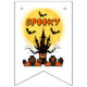 This bunting banner display the words "Spooky" in a unique print font with orange letters plus creepy treehouse, jack o laterns, bats and graveyard with other spooky theme decals in this Halloween theme and style. All banners have single sided printing outdoor safe made with sturdy plastic polystyrene and thick plastic rope has (16) 5.5" x 8" swallowtail flags on a 6' long string.