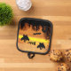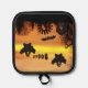 At Halloween time in the kitchen, safely handle baking trays, cookie sheets and muffin tins from the oven with this pot holder with black trim that features a spooky, scary image of flying ghosts and bat against an orange, evening sky. Select your pot holder backing style.