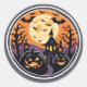 This circular sticker features a classic Halloween scene with an orange moonlit sky, spooky bats, and eerie bare trees. At the centre, a haunted house stands with glowing windows, surrounded by two menacing jack-o'-lanterns. Perfect for adding a spooky yet fun touch to Halloween decorations, invitations, or party favours.
